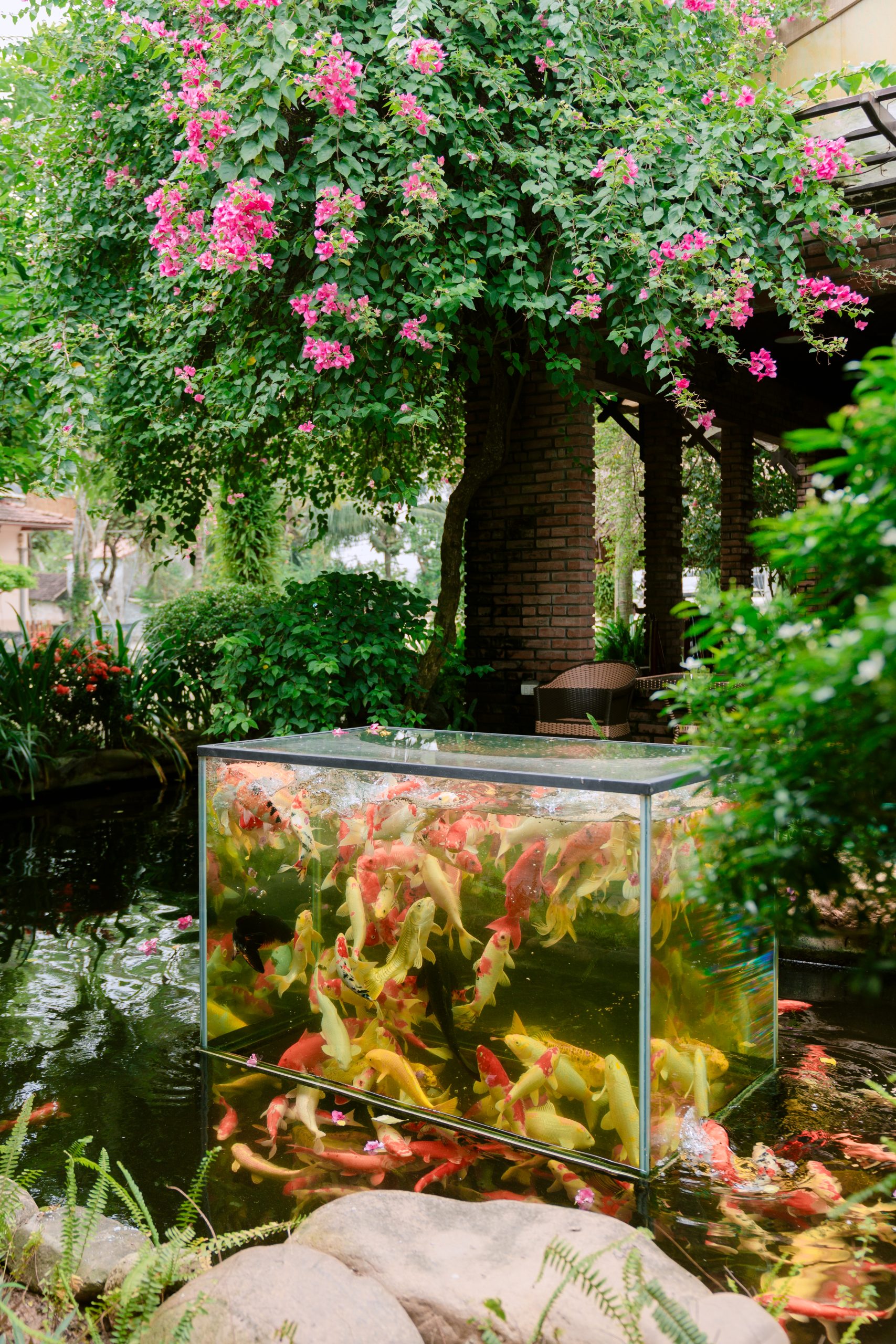 Trong tâm thức người Việt, hình ảnh của những cây đa, giếng nước, sân đình luôn gợi ý niệm về sự thân thuộc, yên ả, bình yên. Với ý tưởng thiết kế đơn giản, trang nhã, không quá khó để khoác chiếc áo hoang sơ, tinh khiết, trong lành cho sân vườn nơi đây. Suối cá hình chữ Tâm, Phúc chảy xung quanh, thêm vài chi tiết nhấn nhá có dụng ý như con đường trải đá quanh co, những thảm cỏ xanh mướt mát,… “hơi thở” tự nhiên đã thổi mát toàn bộ khung cảnh của nhà hàng sân vườn GARDEN.