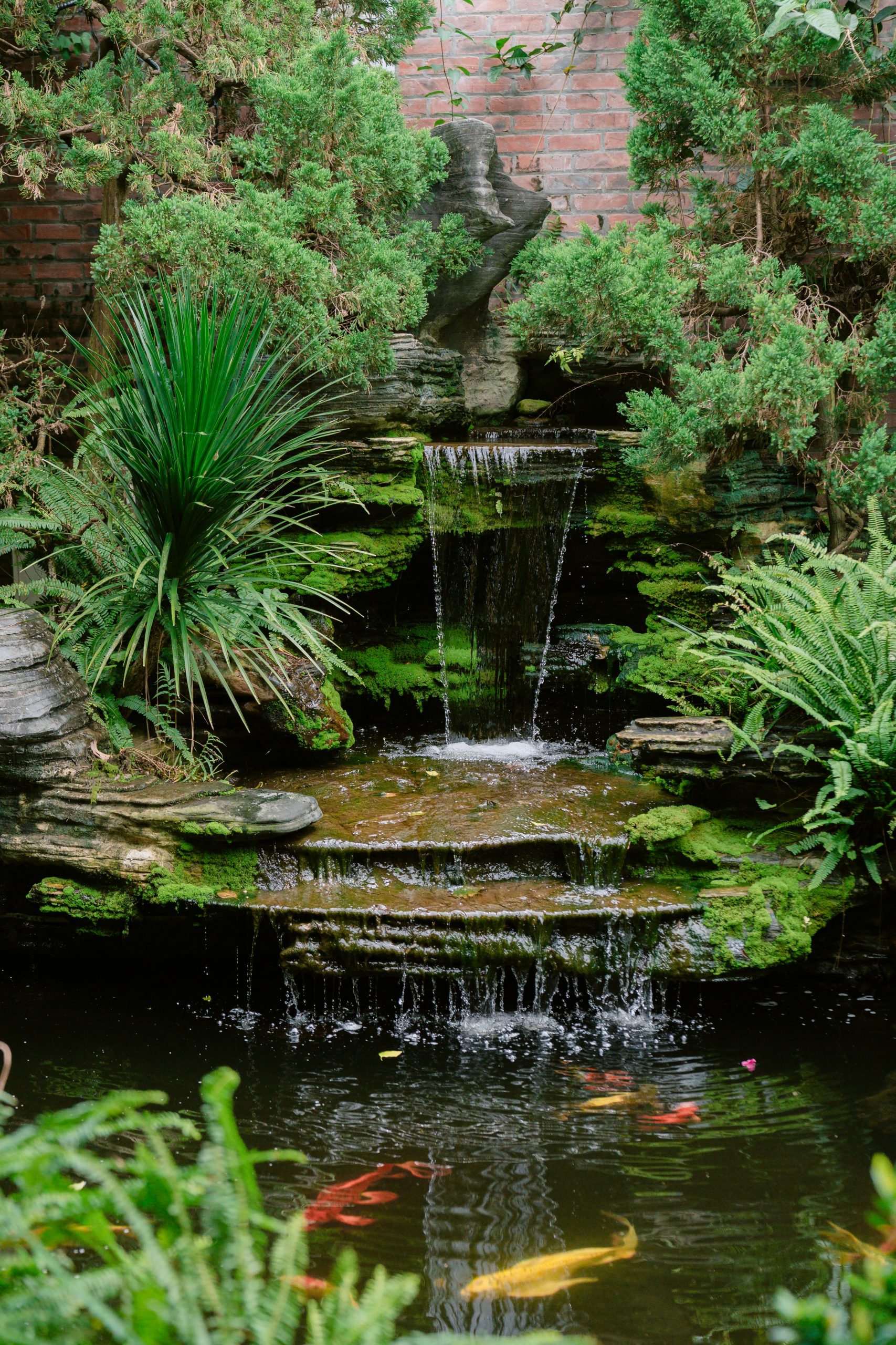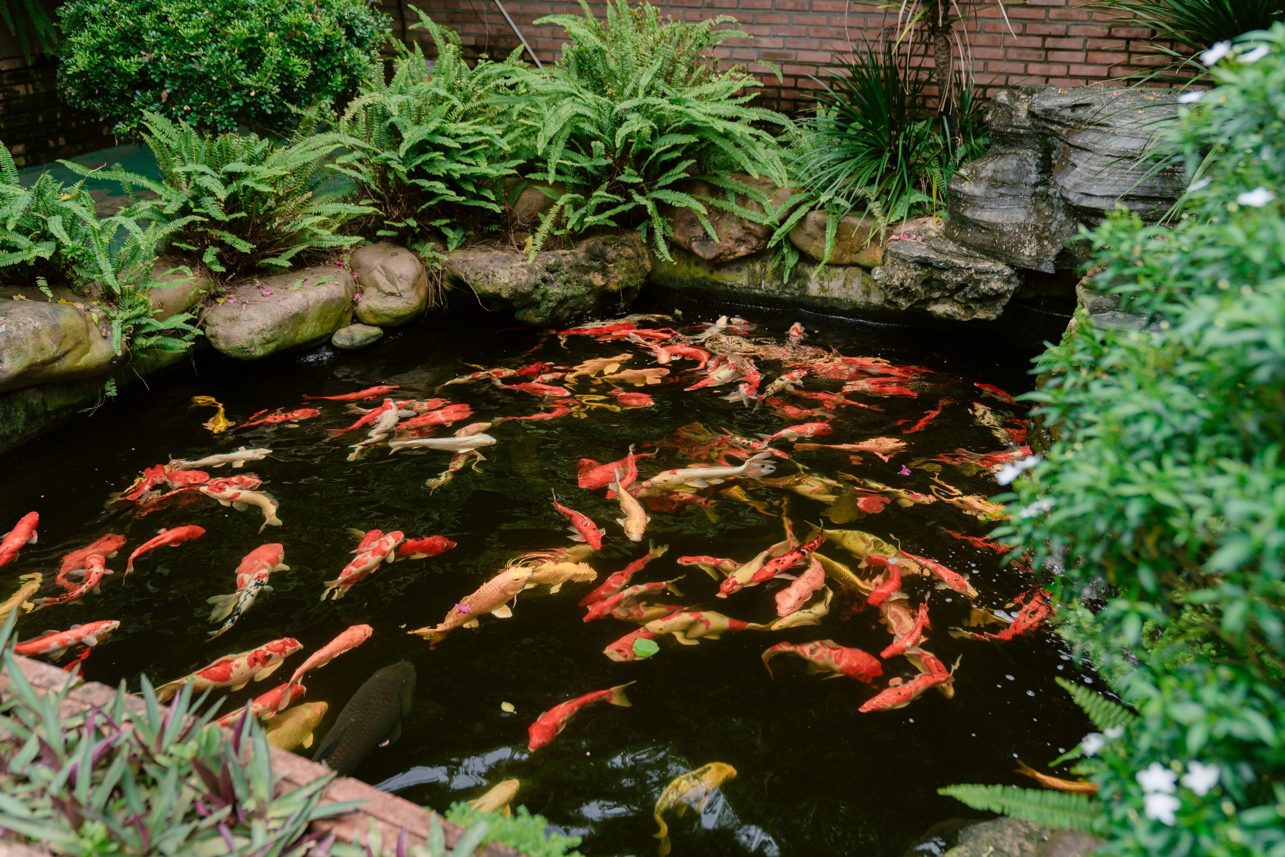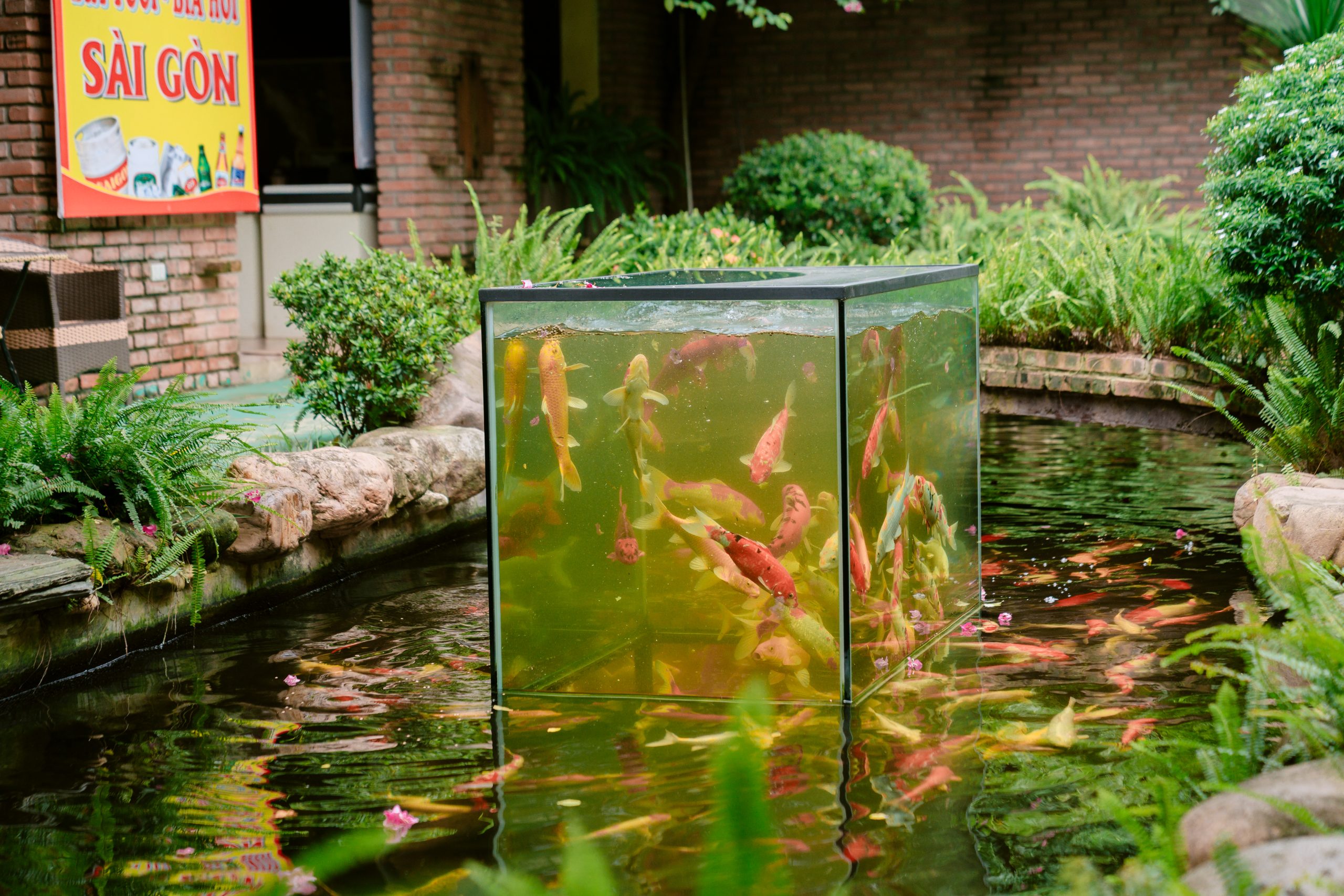 Trong tâm thức người Việt, hình ảnh của những cây đa, giếng nước, sân đình luôn gợi ý niệm về sự thân thuộc, yên ả, bình yên. Với ý tưởng thiết kế đơn giản, trang nhã, không quá khó để khoác chiếc áo hoang sơ, tinh khiết, trong lành cho sân vườn nơi đây. Suối cá hình chữ Tâm, Phúc chảy xung quanh, thêm vài chi tiết nhấn nhá có dụng ý như con đường trải đá quanh co, những thảm cỏ xanh mướt mát,… “hơi thở” tự nhiên đã thổi mát toàn bộ khung cảnh của nhà hàng sân vườn GARDEN.