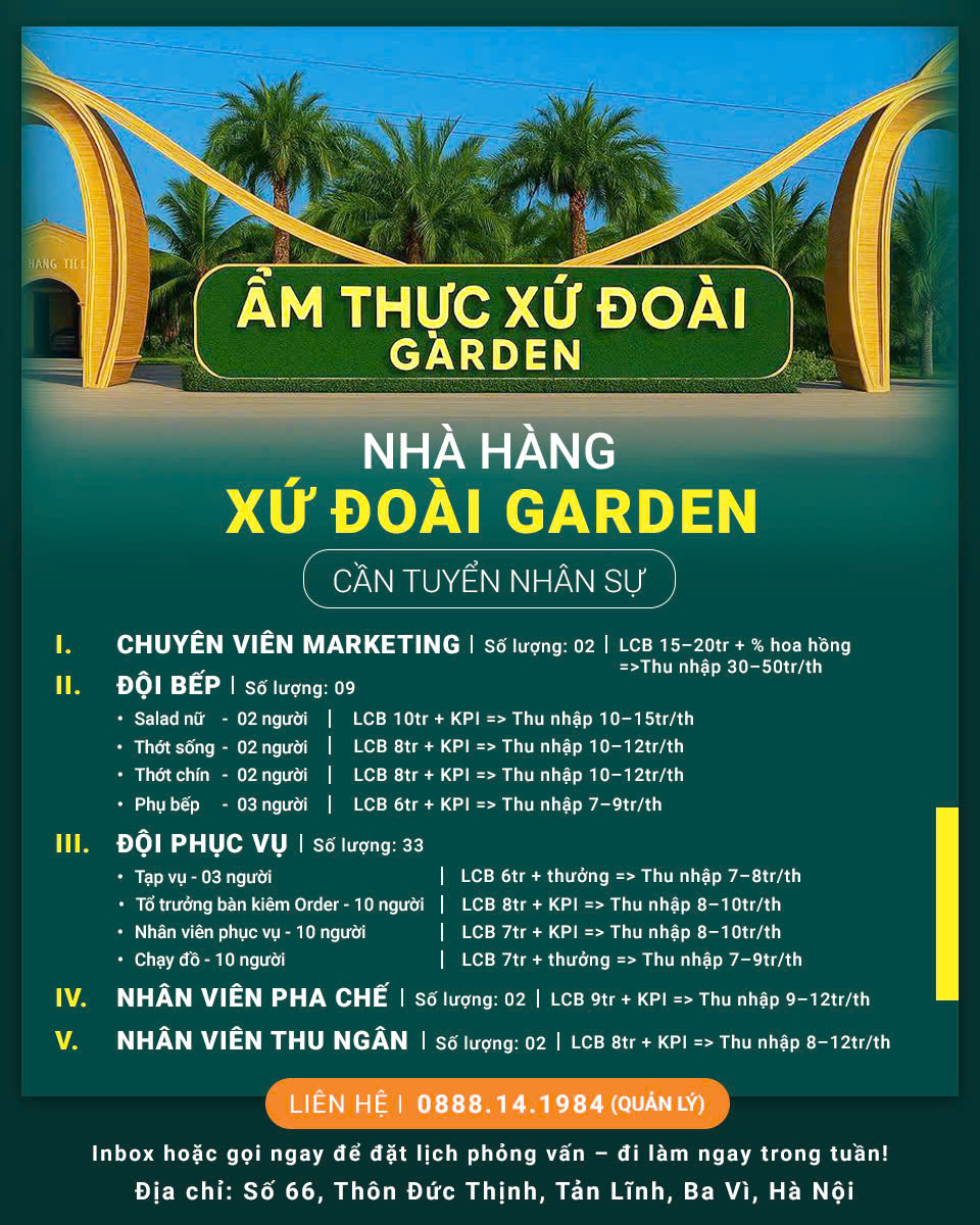 XỨ ĐOÀI GARDEN TUYỂN DỤNG NHÂN SỰ NHÀ HÀNG